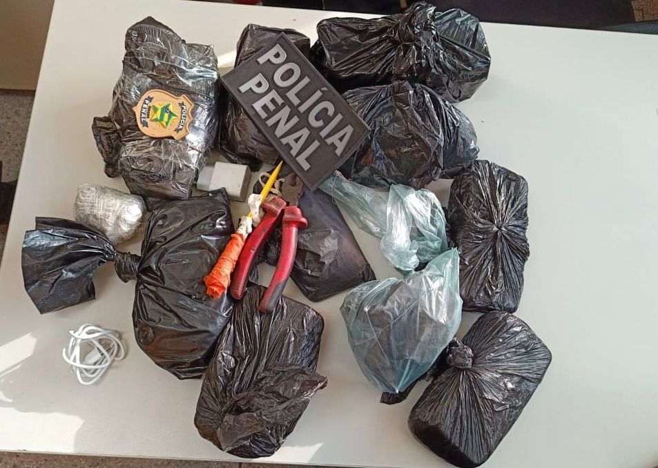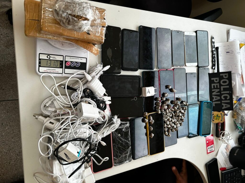 No total, foram apreendidos 22 aparelhos de telefone celular acompanhados de seus carregadores, seis fones de ouvido, um alicate de corte, além de 1,3kg de substância análoga à maconha.