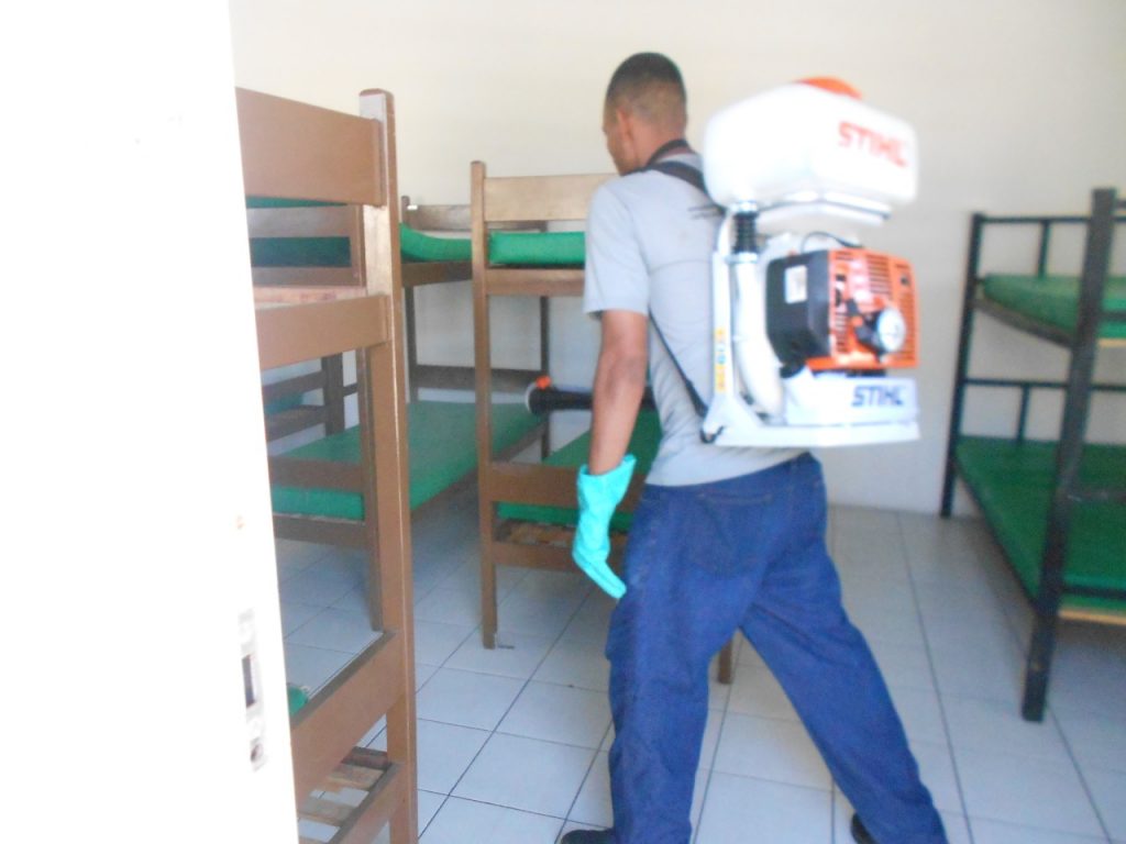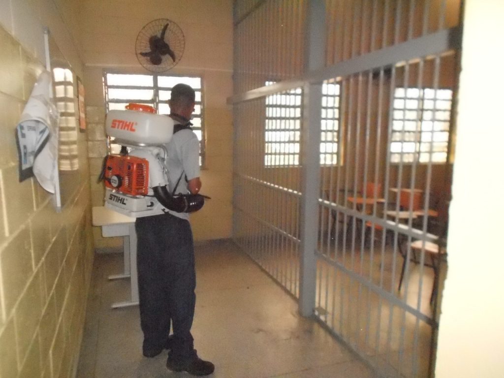 A solução de hipocloreto é diluída em uma bomba intercostal, e é passada em todas as celas e ambientes frequentados pelos internos e agentes. “Essa limpeza é feita dia sim e dia não e se necessário todos os dias”, concluiu.